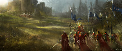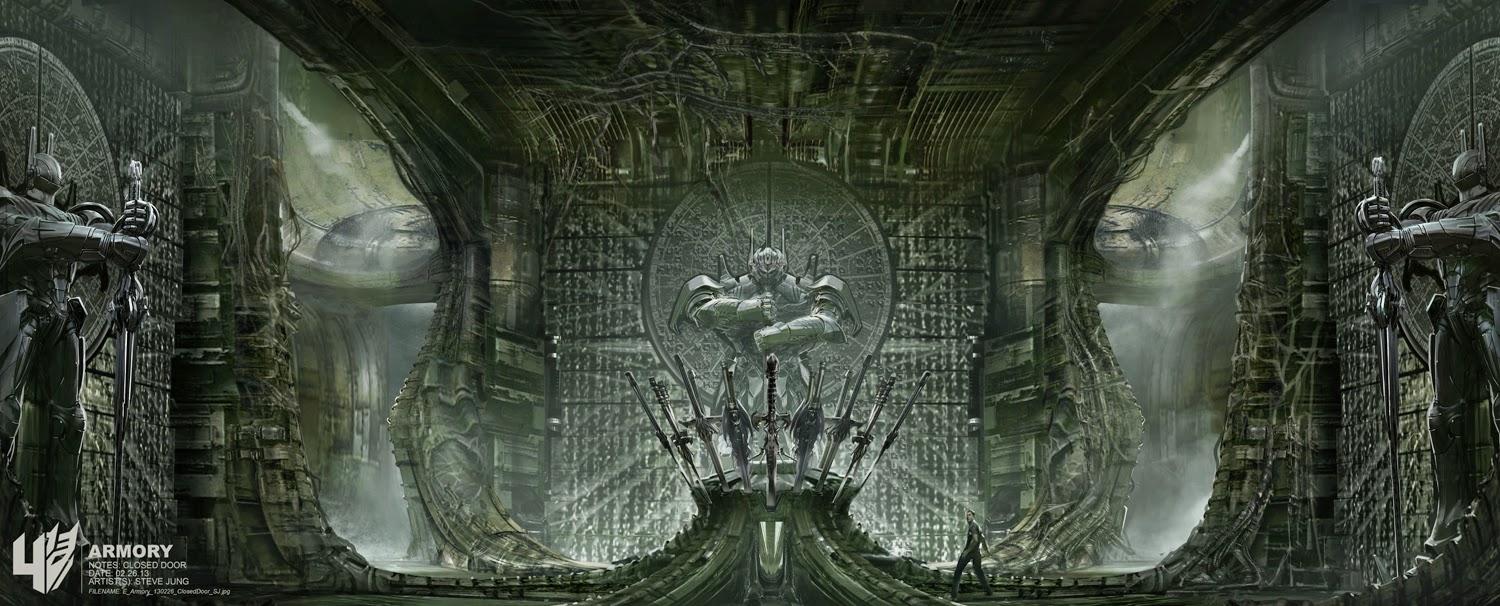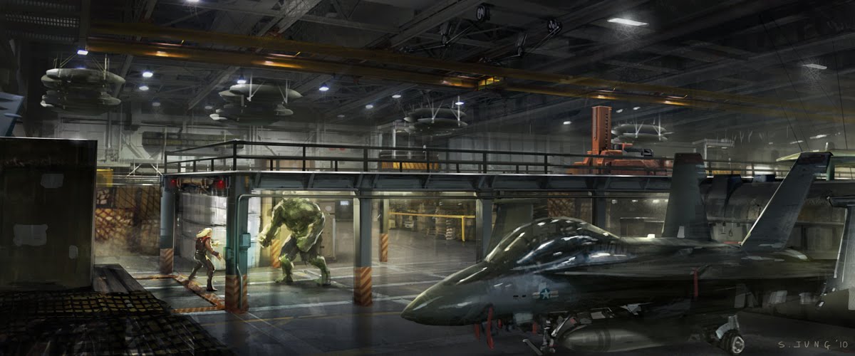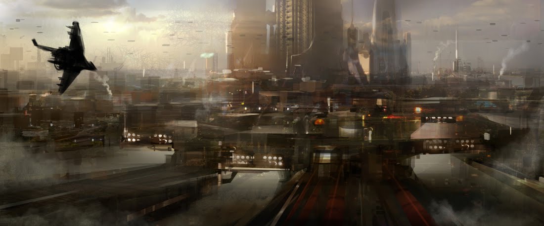 1.Set a rough color tone and sketch a scene. Keep each objects in separate layers, so I have the background sketch, aircraft 1,2,3, and four plus the 3 characters in separate layers. 2. Paint the background using texture brush and lasso background elements from mid-ground. Hard edge on the light side and soft edge on the dark side for interest. 3. Silhouette out the sketches. 4. aircraft - add textures using layer mask. push and push with overlay and color dodge the highlights. Characters - using airbrush set the mid tone. use overlay to push and pull highlight and shadow. add bounce light and make a new layer under the silhouette to hit a very strong rim light. 5. Define shapes and add accent colors and detail lines. Bring in bounce lights. 6. Add atmosphere and soft light layer some textures. and add glows. Done! overall this took me about 3 hours. My composition choice was to have a big shape on the left with the foreground aircraft and I balanced the right side of the frame with smaller objects 3 aircraft and 3 characters (design is more interesting in odd numbers) I connected the 2 groups with the background arch.