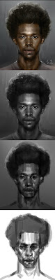 3. Using the lasso tool I traced the sketch in to a more clean organized shape. I layer masked the silhouette and did a gradient fill light to dark from top to bottom. Since the gradient fill established the mid value I proceed to indicate the light and shadow using round brush and photo texture (soft light layer)