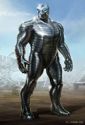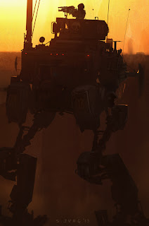 4. I color dodged where the sun might be and changed the silhouette to show a soldier riding the mech. I added highlights and glows using color dodge as well.